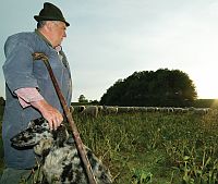 Doch Schäfer Dangel ist zufrieden. Stolz blickt er auf seine Herde. Die untergehende Sonne scheint ihm gerade noch unter die Hutkrempe. Er genießt den idyllischen Augenblick. (2006)