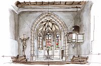 Ja, es ist eine besondere Kirche, die von Gruorn. Wahrscheinlich ist sie sehr alt, älter als man das aus den überwiegend gotischen Formen von Fenster-Maßwerken und Gewölben schließen möchte. Irgendwann einmal wurden ältere rundgewölbte Fensteröffnungen freigelegt, die auf einen Bauanfang in der Romanik schließen lassen, in das 11. Jahrhundert vermutlich. Wahrscheinlich war es anfangs nur ein einfacher rechteckiger Raum mit