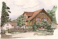 nach den Leitlinien des Bioland-Verbandes erzeugt und aufbereitet. Etwa 1850 siedelte sich ein Landwirt mit seiner Familie dort an und baute die Wohn- und Hofgebäude, so etwa, wie sie heute noch als Kern dieser Anlage da stehen. Zwei große, einander gegenüber stehende Gebäude flankieren einen rechteckigen Hof. Das eine ein Wohnhaus, das andere Bäckerei und Wohnung der Bäckersleut. Nach Westen schließt ein niedrigerer Verbindungsbau, heute Altenteil, die Anlage ab. Alles Gebäude, die mit ihren ziegelgedeckten Dächern, holzverschalten, mit hellem Putz wechselnden Wandflächen, farbigen Fensterläden und dem alles überwuchernden Fassadengrün zu einer schlichten, naturnahen Einheit zusammengewachsen sind. Eine riesige Kastanie markiert als Hofbaum" den Platz. Für sie und ihre Pflege haben die Hofbewohner erst kürzlich im Landeswettbewerb Hofbaum den zweiten Preis erzielt. Zwölf Hektar hat dieser Hof, fast alles mageres, dafür aber