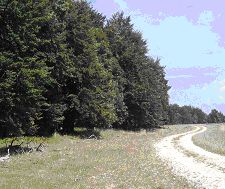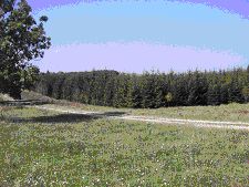 Abb.18: Nadelholzaufforstung südlich von Gruorn So wurden in den Mulden des inneren Übungsplatzbereiches des öfteren Aufforstungen mit Nadelhölzern errichtet, die als Rückzugsflächen für die übenden Truppen dienten. Der Vorteil von Nadelholzaufforstungen besteht darin, dass diese im Gegensatz zu Laubhölzern immergrün sind, das heißt das ganze Jahr über Nadeln tragen und so "Schutz" bieten, außerdem sind sie wesentlich dichter und damit undurchsichtiger.