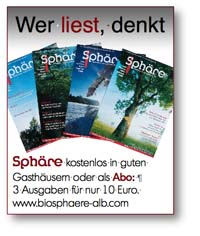 Dadurch gewinnt auch die Idee Biosphärengebiet Schwäbische Alb. SPHÄRE ist das gelebte Bindeglied zwischen Vision und Realität, zwischen Bewohnern und Besuchern, zwischen Bürgern und Politik. Der Sonnenuntergang des Titels der neusten Ausgabe zeigt schon jetzt: Golden ist die Stimmung für die Zukunft der Biosphäre Schwäbische Alb..... (© 15. 7. 2008)