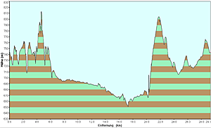 29,3 km: Gestütshof St. Johann - Heerstraße - Lonsinger Tal - Degental - Zizelhäuser Tal (Gächinger Lauter) - Gächingen - Auental - Upfingen - Römischtal - Rutschenfelsen - Fohlenhof - Hohe Warte - Gestütshof St. Johann