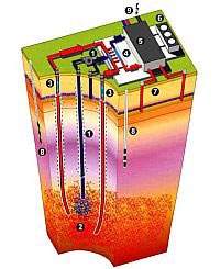 Das Grundmodell eines geothermischen Kraftwerks: Im heißen,