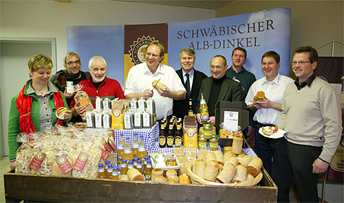 Diese drei Akteure sind auf der Messe umgeben von weiteren Anbietern regionaler Produkte, die ein loser, aber effektiver Zusammenschluss verbindet. Das ideelle Netzwerk (Foto rechts) umfasst die Tress Gastronomie Ehestetten, die Metzgerei Failenschmid aus Gächingen, Zwiefalter Klosterbräu, AlbGold Teigwaren aus Trochtelfingen, Burkhardt Fruchtsäfte aus Laichingen, Schmid's Hotel- und Erlebnisgastronomie Bad Urach, Woldemar Mammel Erzeugergemeinschaft „Alb-Laisa", den Forellenhof Rössle aus Ilonau und das Lagerhaus an der Lauter in Dapfen. Sie alle verbindet ein Ziel: „Wir wollen die Schwäbische Alb als Markenzeichen für Genuss etablieren", beschreibt Heinrich Beck die Intention. Mit innovativen Ideen setzen die Hersteller von der Alb Zeichen für eine gesunde Ernährung mit regionalen Produkten, wobei der Genuss nicht zu kurz kommt. So entwickelte Burkhardt Fruchtsäfte eine Kräuterschorle, kreierte Tress Gastronomie Biosuppen und bietet die Metzgerei Failenschmid Albwacholderschinken sowie Spezialitäten rund um den Albbüffel an. Die Firma BeckaBeck bringt immer wieder neue Produkte aus Schwäbischem Alb Dinkel und Alb Weizen, Zwiefalter Klosterbräu bietet Dinkelbier an und Alb Gold hat ein breites Sortiment an Dinkelnudeln. Das Lagerhaus an der Lauter verwöhnt mit feinen Pralinen seiner Chocolaterie, die Erlebnisgastronomie Schmid überzeugt durch Qualität und Kreativität ihrer Küche unter Verwendung heimischer Produkte, wie auch dem Dinkel, und der Forellenhof Rössle ist bekannt für seine Fischspezialitäten und seine hervorragende Küche. Neue Produkte auf der Slow Food
