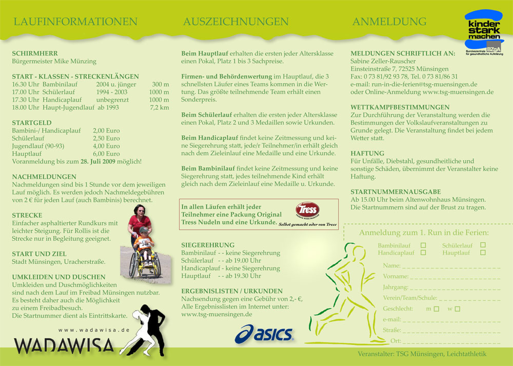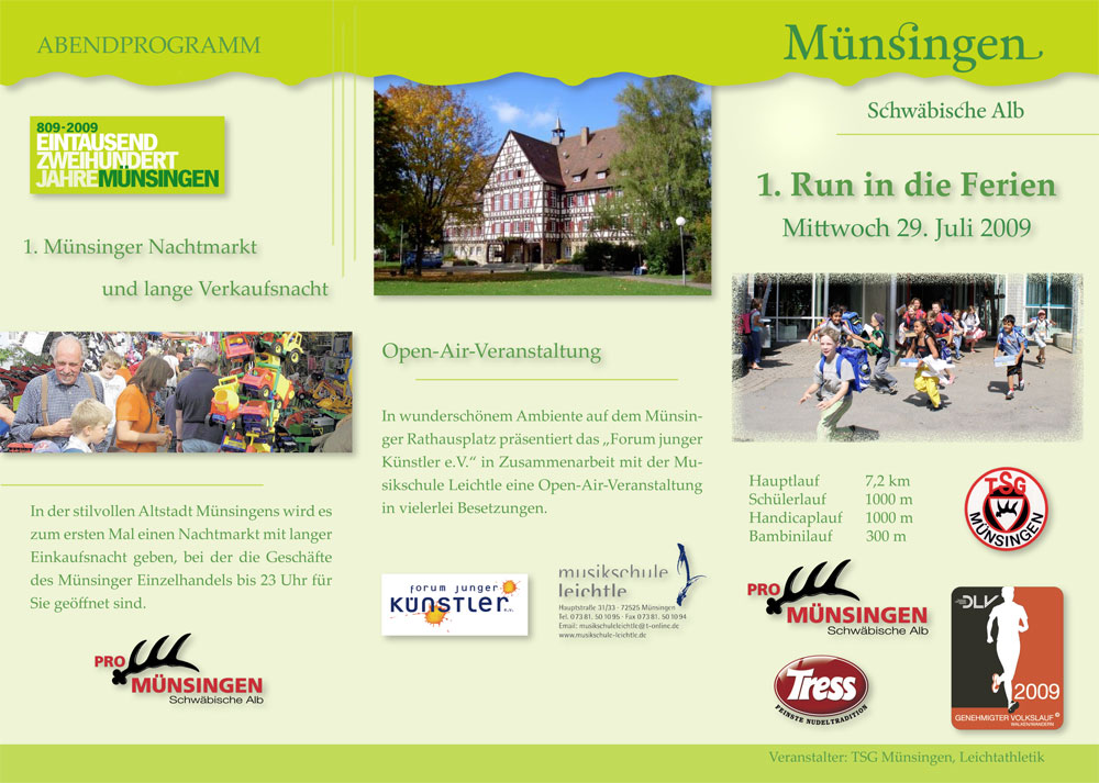 Freizeit: 1. Münsinger Nachtmarkt und Run in die Ferien Endlich wieder FerienSchlendern oder rennen. Am Mittwoch den 29. Juli 2009 findet im Rahmen der 1200-Jahr-Feier in Münsingen ein lange Verkaufsnacht und eine Laufveranstaltung statt. Dieses Event im Herzen der Schwäbischen Alb, soll nicht nur Kinder, sondern auch Erwachsene in eine bewegte Ferienzeit schicken. Mit dabei ist auch ein Handicaplauf. Nach dem Lauf findet eine Open Air Musikveranstaltung vor dem malerischen Rathaus statt. In der Innenstadt sind die Läden bis in die Nacht geöffnet. Für Touristen bietet die Alb in den darauf folgenden Tagen sicherlich viele sportliche und sehenswerte Möglichkeiten. Sie möchten den Artikel gerne weiterempfehlen? Dann klicken Sie bitte hier >> |