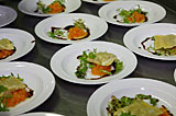 Wohlfühl Hotel „Graf Eberhardt“, Bad Urach Rezept für 4 Personen Zutaten: 480 g Rehrückenmedaillons (12 Stücke à 40 g) Zubereitung Fleisch: Kräuter und Sonnenblumenöl mit einem Stößel zu Brei reiben. Fleisch abtrocknen, leicht platt klopfen, mit den Kräutern bestreichen, in Klarsichtfolie wickeln, etwa 3 Stunden im Kühlschrank ziehen lassen. Zutaten für die Soße: 10 g Butter Zubereitung Soße: Orangen waschen, von der gewaschenen Orange mit dem Juliennereißer ca. 3 cm lange Streifen reißen. Orange schälen, filetieren und in 1 x 1 cm große Würfel schneiden. Zutaten für Spitzkohl mit Feigen: 600 g Spitzkohl Zubereitung Spitzkohl: Spitzkohl in dünne Streifen schneiden (ca. 3-5 mm) und in kochendem Salzwasser blanchieren, bis er bissfest ist, herausnehmen und beiseite stellen. Zutaten für Chilispätzle: 4 Eier Zubreitung Chilispätzle: Topf mit Salzwasser aufkochen lassen.