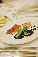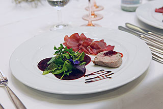 Flair-Hotel Restaurant „Vier Jahreszeiten“, Bad Urach Rezept für 4 Personen Zutaten: 500 g Kartoffeln 2 St. Brokkoli 600 g Rehleber Zubereitung: Kartoffeln waschen, schälen, in feine Streifen schneiden und in eine feuerfeste Form geben. Brokkoli waschen und in kleine Röschen schneiden, im kochenden Salzwasser blanchieren. Von der Rehleber sämtliches Fett wegschneiden und in 0,5 cm dicke Scheiben schneiden, anschließend noch einmal halbieren. Zum Anrichten alle Zutaten auf einen flachen Teller geben und mit Petersilie dekorieren.