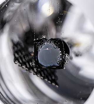 Detailaufnahme der photoelektrochemischen Solarzelle im Sonnensimulator: Wasserstoffgasbläschen bilden sich an der mit Licht bestrahlten Solarzelle. Foto: © Valentin Marquardt / Universität Tübingen