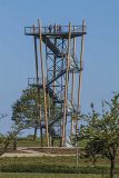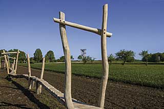 Egal, welche Route Sie wählen, den 18 Meter hohen Aussichtsturm sollten Sie zur Aufwärmung erklimmen (Foto links). Vier Holzstützen, die nach oben umgekehrt konisch verlaufen sowie zusätzliche filigrane Stahlträger verankern eine dreieckige Plattform in Anlehnung an ein keltisches Symbol.