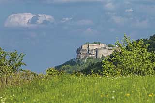 Der Albtrauf-Pfad als Teil des Fernwanderwegs HW1 (Tour 3) dreht die Zeit nur um rund 900 Jahre zurück. Er windet sich zur Burg Hohenneuffen (➍). Die Highlights unterwegs: Vesperpause im Biergarten des Burghofs, Ausblicke über die Stadt Neuffen hinweg zum schmalen Gebirgsrücken, der den Vulkanschlot Jusi mit der Albhochfläche verbindet sowie der Rückweg über den Astropfad.