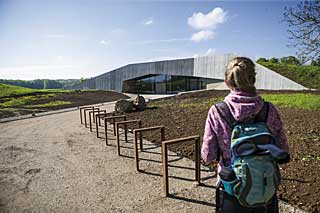 Außer Puste oben angelangt, bestaunt der Besucher einen Landstrich, auf dem vor 2000 Jahren schon die Kelten gewirtschaftet hatten: Den Heidengraben. Die noch heute sichtbaren Senken, Wälle und Zugänge begrenzen die mit 1700 Hektar größte Keltensiedlung Mitteleuropas. Allerdings hat die Zeit weitere markante Spuren des keltischen Oppidums verwischt. Dafür aber gibt es viel zu lernen und erfahren. Das im Juni eröffnete Heidengrabenzentrum (Foto unten), wenige hundert Meter vom Turm entfernt, katapultiert die Besucher multimedial 2000 Jahre zurück. Wie hat es damals hier ausgesehen, wie haben die Kelten gewirtschaftet, gefeiert und getrauert? Heute noch erkennbare Grabhügel wirken, als hätten sie Pate gestanden bei der Gestaltung des Gebäudes, ein monumentaler begrünter Hügel aus Beton.