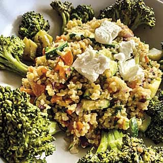 Viel Gemüse hilft viel. Das Bulgur-Gericht kombiniert leckeren Brokkoli mit fein gewürfelten Karotten und Zucchini. Der Schafskäse rundet die Mahlzeit nicht nur ab, sondern spendiert dieser Vitaminbombe einen ordentlichen Schuss Proteine.