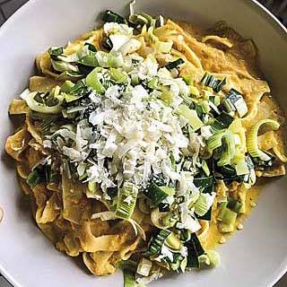 Anrichten und servieren: Die Nudeln mit der Karotten-Soße vermengen und den gedünsteten Lauch als Topping verwenden. Mit frisch geriebenem Parmesan bestreuen und sofort servieren.