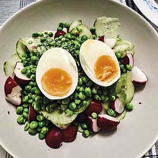 Die kräftigende Sommer-Mahlzeit kombiniert knackige Radieschen mit eiweißreichen Erbsen, frischer Gurke, gekochtem Ei und einem kühlen Joghurt-Dressing. Die Muskeln freuen sich über zwei starke Proteinquellen auf einem Teller.