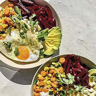 Diese Reis-Bowl interpretiert den Ernährungstipp „Eat the Rainbow“ im wahrsten Sinne des Wortes. Buntes Pfannengemüse, grün-cremige Avocado, Rote Beete und ein goldgelbes Spiegelei verwandeln den Teller in einen farbenfrohen Augenschmaus.