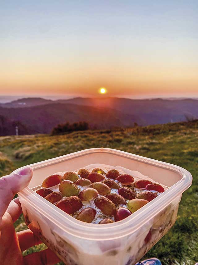Die ersten Sonnenstrahlen des Tages klettern über die sanften Höhen der Schwäbischen Alb. Der Kaffeeduft glänzt in silbernen Dampfsäulen in der noch kühlen Morgenluft. Ich weiß nicht, was mich lebendiger macht: der Schluck meines tiefschwarzen Getränks, die Strahlen unseres goldroten Heimatsterns oder die grüne Stille auf dem Rücken dieses Fleckchens Natur. In so einer Kulisse schmeckt mein zubereitetes Frühstück noch besser als sonst. Zwischen Himmel und Erde auf einem Berg mit der Müsli-Schüssel in der Hand schaue ich zu, wie die Sonne den Himmel erobert.