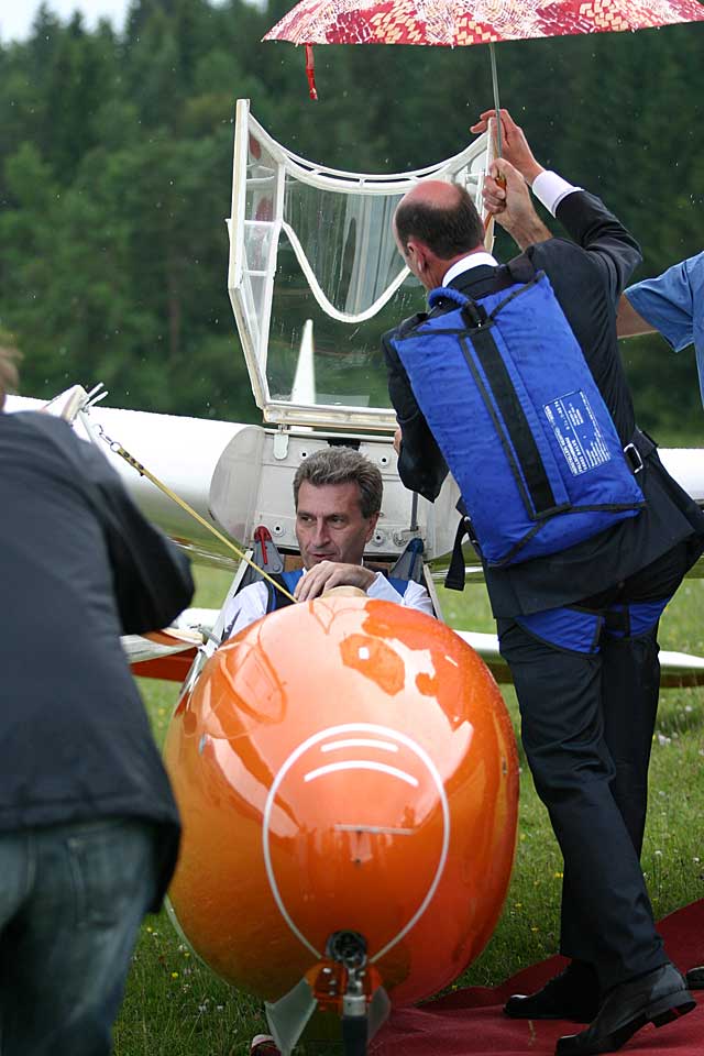 Wird die Biosphäre ein Überflieger? Die blitzschnelle UNESCO-Anerkennung zumindest treibt die Alb wie eine Gewitterthermik den Segelsportler zu wahren Höhenflügen. Nicht zuletzt deshalb gönnte sich der Ministerpräsident Günter Oettinger am 26. Juni die Vogelperspektive. Zur feierlichen Übergabe der UNESCO-Urkunde segelte er mit dem Grand Prix Vizeweltmeister Uli Schwenk direkt ins Alte Lager Münsingen ein.